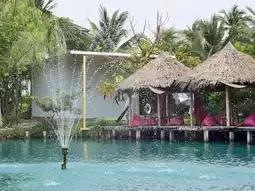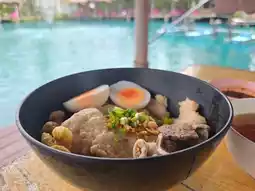 Kot Moo Rim Nam is a restaurant located in Phutthamonthon, Nakhon Pathom Province. There is a lot of parking space. The atmosphere in the restaurant is very good. It is very inviting. In the middle, there is a pond and a pavilion for sitting. The atmosphere of the restaurant in the picture looks shady and very relaxing. It stands out with a clear blue pond with a fountain in the middle, adding freshness and aesthetics while eating. Around the pond, there are wooden pavilions and Bali or tropical style seats decorated with pink and purple cushions, looking inviting. There is a thatched roof giving a natural feeling. Surrounded by large green trees, it feels like being in a resort in the middle of nature. It is suitable for relaxing and eating.