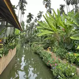 A "Glass House" cafe nestled amidst a coconut, lemon, and areca nut grove, offers a lush atmosphere perfect for relaxing, sipping coffee, and snapping photos for social media. There are a variety of seating options: air-conditioned rooms, a breezy terrace, or even a bamboo raft floating on a raised canal.