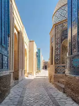 The Shah Izindag Mausoleum is a 14th-century mausoleum considered one of the finest buildings in Central Asia. The mausoleum is decorated with exquisite tiles and carvings inside and outside, making it a must-see for tourists. There are a total of forty-four tombs here. The blue porcelain stickers outside the tombs show different colors such as blue-green, treasure lake blue or peacock blue as the light changes throughout the day. A magnificent mausoleum avenue is laid out in it. Although this road of the dead is less than 100 meters long, it is beautiful no matter where you stand and take pictures.