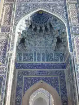 The exterior is beautifully adorned with intricate blue tiles typical of Samarkand, giving it a serene and slightly compact atmosphere🤍