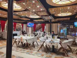 On the first floor, tables are adorned with tablecloths, and soft, calming music plays in the background. The ceiling here is a masterpiece in itself.