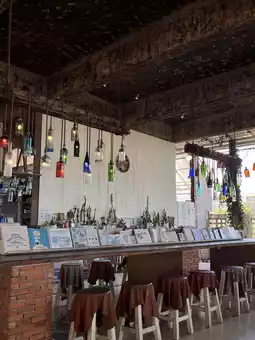 It's a place with an amazing atmosphere, delicious food, and the banana crepe is the best. The banana crepe is exclusively available here. If you visit during sunset, it's incredibly beautiful as flocks of birds surround the area. There's also an activity zone for painting plaster and ceramic figures. For those who love drawing and painting, you can purchase items to paint right there.
