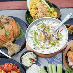 Today, the whole family came to eat. My great-grandmother said that it's been a while since we've been able to get out and breathe in the fresh air like this. We're hungry, so let's order some food. Today, we ordered pineapple fried rice, fried shrimp with salad cream, the kids' favorite, sour and spicy catfish soup, stir-fried minced pork with chili and ginger, fried sea bass with fish sauce, and a must-order menu when we come, Moken, stir-fried sea crab with curry powder. The crab meat is fresh and firm. After we finished eating, my kids asked to order iceberg watermelon to finish it off. It was so good.
