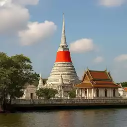 Wat Phra Samut Chedi is located opposite the Samut Prakan Provincial Hall. It's easily accessible by car and ferry. The peaceful and shady riverside atmosphere is perfect for resting your mind and paying homage to the sacred and beautiful Buddha image in the Subduing the Ocean Posture, the temple's principal deity.