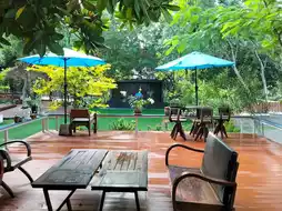 The resort also features a wooden deck extending over the water, where you can enjoy your morning coffee or have dinner while watching the sunset—an experience that's truly delightful. For those who wish to explore nearby attractions, there are places like the "Phanthai Norasing Shrine," "Mahachai Canal Market," or "Bang Krachao of Samut Sakhon" to visit during the day.