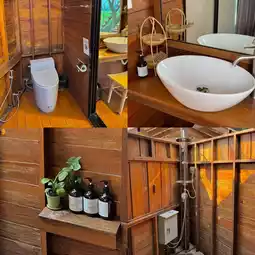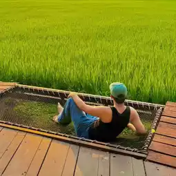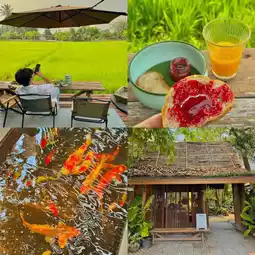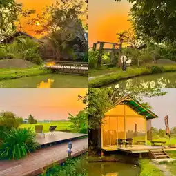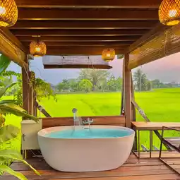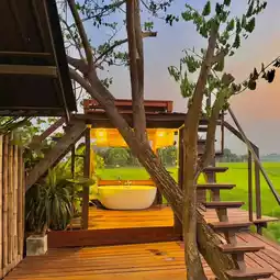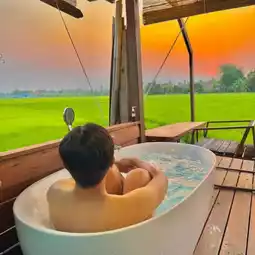 We stayed at Baan Rim Na, a simple wooden house with a very cozy atmosphere. You can lie down and look at the wide, green rice fields, which are refreshing and pleasing to the eyes from your bed. There is also an outdoor bathtub. It feels great! It is perfect for relaxing and healing your heart, and being with nature. 🛏️🌳