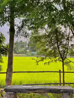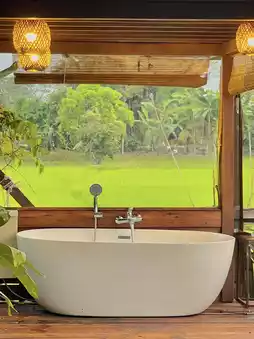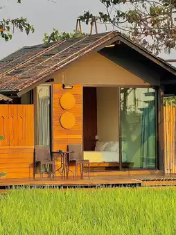 Let's go to sleep in a very cozy wooden house in the middle of a green rice field