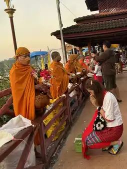 Early in the morning at six in the morning, leave your accommodation to make merit and offer alms. You can offer alms on both the Thai and Mon sides. On the Thai side, it will be from 6:00 to 7:00. On the Mon side, it will be a bit later in the morning, and you can walk across the bridge. Most of the alms offerings are sold as sets, and there are also cute Mon costumes to borrow. I highly recommend that anyone who visits here must not miss it.