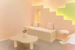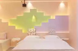 The fluorescent geometric wall and warm light under the bed are super soothing, with a little bunny pillow and a projector—perfect for binge-watching shows without wanting to go out!