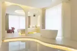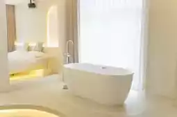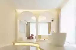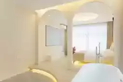 The room is overall a gentle and soothing cream color scheme, paired with arched designs, full of artistic vibes. The most eye-catching feature is the standalone white bathtub, equipped with movie-watching devices nearby, so you can enjoy a blockbuster while soaking in the tub, maximizing the sense of ceremony.