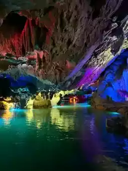 The caves here are diverse and have peculiar shapes, with the most remarkable being the stalactites and stalagmites that resemble swans. From a distance, they look like masterpieces meticulously carved by nature. Stepping inside the caves, the cool air and tranquil atmosphere instantly relax you. The light streaming through the cave openings illuminates the stalactites, making each rock seem to glow, creating a mysterious and magnificent scene. Beyond the caves, the surrounding natural environment is equally captivating, with dense forests and undulating mountains.