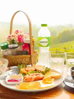 The spacious rooms feature bathtubs with mountain views 🛁✨, perfect for soaking in the soothing bubbles amidst nature. Breakfast is served in a lovely and delicious basket 🍳🥗🥖. The cafe offers a relaxing coffee corner with a panoramic view of the sea of mist, guaranteed to leave you wanting to capture the beautiful scenery 📸.