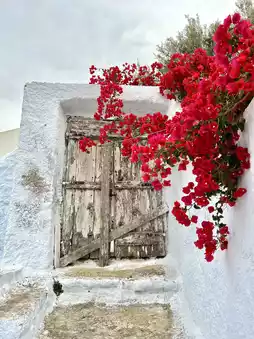 April is the perfect time to visit Santorini! The weather is just right—warm and sunny, but not too hot—making it an ideal season for exploring. One of the most beautiful places to wander around is Pyrgos, a charming village filled with blooming flowers and traditional white-washed houses.