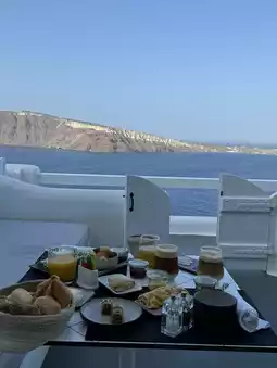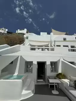 🏖️ Atmosphere/Facilities: A cave-style hotel designed with the iconic white theme of Santorini. Rooms come with showers, and some include bathtubs.