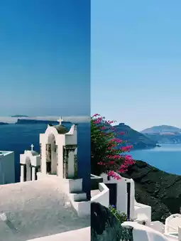 The alleyways of Oia village grew warmer as the sunlight descended. The light cascading down the white walls, the breeze caressing them, carried the salty scent of the sea. The harmony of the pink bougainvillea blooming in every alleyway and the blue rooftops was a work of art in itself.