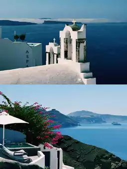 On the way to the accommodation, the sea and red cliffs spread out over the hills, creating a picturesque scene. After unpacking, a stroll through the village of Oia reveals soft sunlight streaming between white buildings. Following the alleys, youโll find blooming bougainvillea and the sparkling sea beyond.
