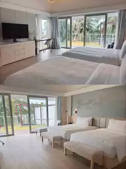 We stayed in a sea-view villa with two bedrooms, a private courtyard, and a heated pool, all for our exclusive use! Outside the pool are beautiful coconut groves and blue sea views, which are spectacular and make for great photos. The room is a double suite with floor-to-ceiling sliding doors and plenty of sunlight. Super cozy.