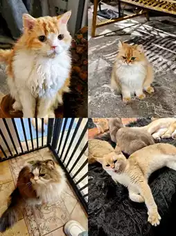 I can't count how many cats there are. The Maine Coon is very handsome, a big one, and the Chinchilla is so cute.