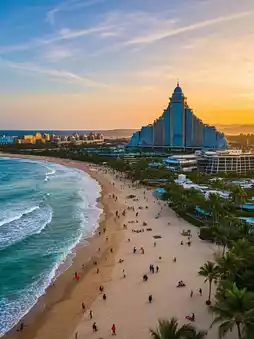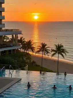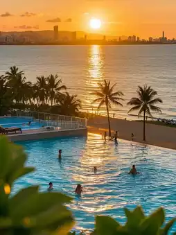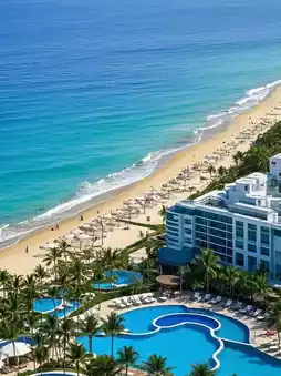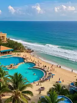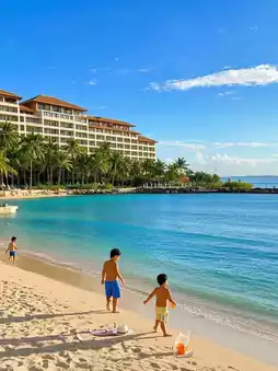 The sand is as fine as flour, and the sea is a clear blue. The hotels here are super luxurious, like the Horizon Resort & Spa, which has great family-friendly facilities, perfect for families with kids. There's also the Ritz-Carlton, which has a great vacation vibe and attentive service.