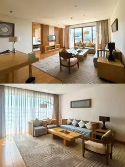 As a Diamond member, I always receive a pre-arrival call, and on several occasions, I've been upgraded to a Deluxe Garden View Suite. The room is nearly 100 square meters, and while it's called "garden view," it actually offers partial ocean views. The room incorporates local Hainan style, with a large balcony connecting the bedroom and living room. The minibar is free for the first round and includes capsule coffee and Twinings tea. The toiletries are Crabtree & Evelyn, and the bathroom fixtures are Hansgrohe, indicating the high-quality materials used. Additionally, the hotel provides a complimentary goodnight sweet soup and a handwritten card, exceeding the level of service expected at this price point.