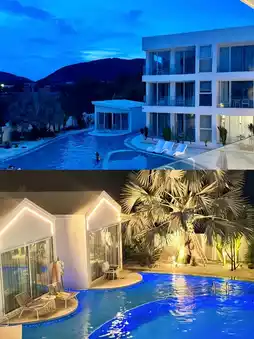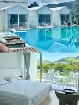 ✅This pool is amazing 🏊♂. The pool area is divided into several sections, and there are people who clean it every day, so it's very clean! There is also a transparent boat. The rooms are right next to the pool! You can get up and jump right in. You can also see the mountain view through the floor-to-ceiling windows while lying in bed, which is super satisfying!