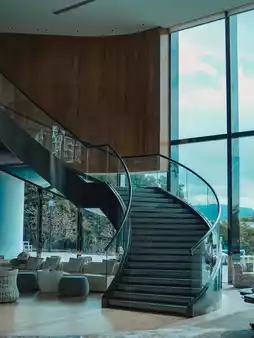 The sunken sofa area, spiral staircase and mirrored waterscape design in the lobby combine natural light and shadow with architectural aesthetics to present an immersive visual experience