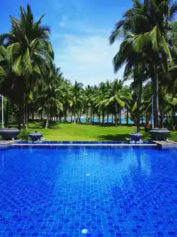 Walking along the path, the coconut grove beach and the swimming pool are cleverly connected, forming a unique sense of edge. The clear pool water sparkles under the sunlight, and contrasts with the sea in the distance, forming a beautiful picture. On the way to the beach, you might come across a few cute little squirrels playing and frolicking among the branches, adding a touch of vitality and vigor to this peaceful environment.