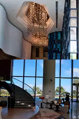 1️⃣ Lobby spiral staircase + floor-to-ceiling ocean view windows, pure elegance!