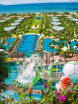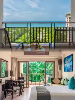 Step into the hotel, and you're greeted by rich tropical vibes. Rooms blend modern aesthetics with island elements, featuring floor-to-ceiling windows framing palm groves and sea views. Plush bedding and smart amenities ensure comfort, while family suites with kid-friendly supplies and themed rooms add playful charm—perfect for friends or family getaways.