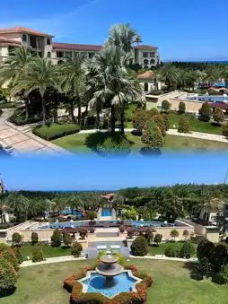 The hotel features Spanish-style architecture, and my dad particularly loved the corridor design. The garden landscape is also beautiful. The suite is spacious, though it's noticeable that it was renovated later—the bed in the living room lacks a headboard, and the nightstand and lamp seem more decorative, with no nearby power outlets. Fortunately, we solved this issue by getting an extension cord through the local contact.