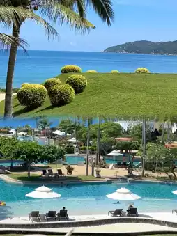 4️⃣ Coral Bay Mandarin Oriental: The ceiling in the public area, the pool, lawn, sea swing, hotel logo, and stone gate are all super beautiful. The rooms are a bit old but very clean and comfortable to stay in. The hotel also offers a wide range of water activities to experience. (P9-12)