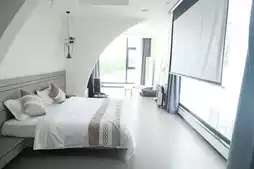 🏡 The homestay’s exterior is pure white, simple yet stylish, perfectly matching the surrounding greenery and blue sky! As soon as you enter the room, you’ll be surprised by the arched doorway and projector. Watching movies in bed at night is just so enjoyable! 🎬