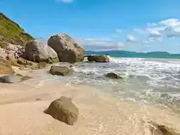 ⬇️The beach is located behind a hill from Yalong Bay. If you're vacationing in this bay, we highly recommend spending a day at Sunny Bay. The mountains on all sides create an incredible atmosphere. The bay is sheltered, and on the left side are picturesque boulders—perfect for photos. The only hotel here is the Park Hyatt Sanya Sun Bay, located slightly off the main recreation area.