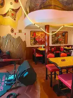 ✨ The bar itself is small but very atmospheric. The interior transports you straight to Spain: waitresses in flamenco-style dresses, fans, castanets, guitars, tambourines decorating the space. In the evenings, there are live performances, and at the center — the Sambomba, Spanish drums. The flamenco rhythms are infectious, and you’ll find your feet tapping along.