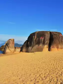 The park is located near Sanya and is considered a symbol of romance for lovers. It's best to visit in the morning to avoid the crowds, explore the pebble beach, and take photos by the boulders.
