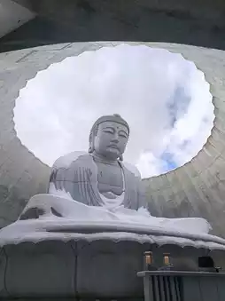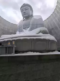 The Hill of the Buddha (Buddha Hill) is a stunning architectural and spiritual site. The stone statue of the Great Buddha is a beloved symbol of Makomanai Takino Cemetery. Looking from outside we are able to see the Buddha head in the middle of the snow dome as per picture No 2.