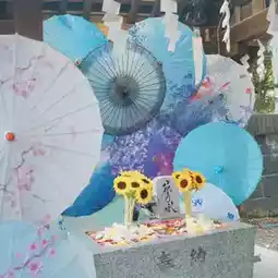 As soon as you step into the shrine, you will be immediately attracted by the "hanatemizu" covered with flowers and the numerous Japanese umbrellas. The colorful umbrellas are changed from time to time. When I visited, it happened to be my favorite blue color. It was really beautiful.
