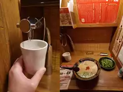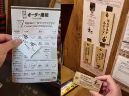 Ichiran Ramen is not a very big restaurant, but the atmosphere is warm and friendly. There are counter seats with wooden partitions on the left and right, like exam tables, so we can sit in a limited space but still maintain privacy.