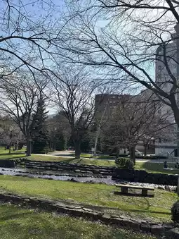 Walking in the park, the pink cherry blossoms are like clouds and rosy clouds, contrasting with the blue sky. The petals fell with the wind, sprinkling on the riverside and the grass, as if covering the earth with a soft pink blanket. There are about 180 Chishima cherry trees planted on both sides of the stream in the Cold Region Civil Engineering Research Institute, which is one of the rare Chishima cherry blossom viewing spots in Japan.