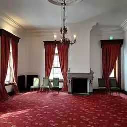 The interior of the building is a contrast to the exterior, with a lot of bright red used.