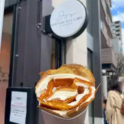 A shop that is irresistible for those with a sweet tooth, where you can enjoy bottled milk, soft serve ice cream, and even popular crepes!