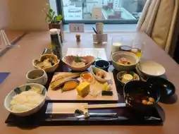 The view is great for zoning out and relaxing. Breakfast the next day can be chosen from two locations. The buffet on the 1st floor starts at 6 AM, while the Japanese restaurant on the 22nd floor opens at 7 AM. After arriving at 3 AM and sleeping until 6:30 AM, I opted for the Japanese breakfast at 7 AM.
