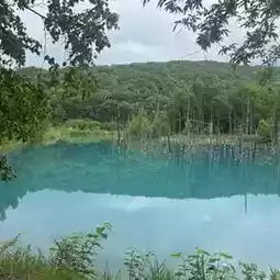 Unrealistically blue pond and majestic waterfall—truly a healing experience.