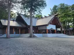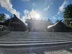 The approach to the shrine is flanked by towering trees, brimming with lush greenery even in summer and early autumn. Before approaching the main shrine, you'll pass a majestic obelisk inscribed with the words "Hokkaido Jingu." This imposing monument symbolizes the shrine's historical significance and the core of local faith.