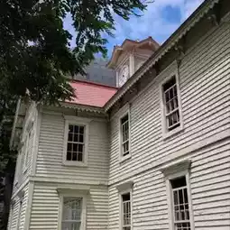 The tower's white wooden exterior, accented by a red roof, stands out amidst the teeming modern skyscrapers. While the building itself is small, it holds profound historical significance, with historical materials and artifacts displayed within.