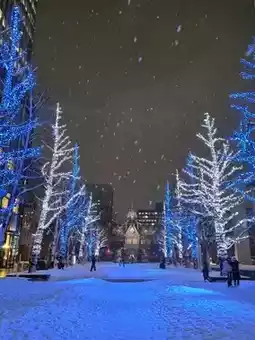 This is a beautiful park with European-style buildings and trees lining both sides. At night, the trees are illuminated, creating a Christmas atmosphere.
