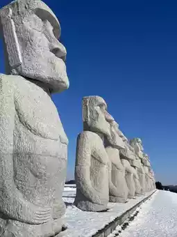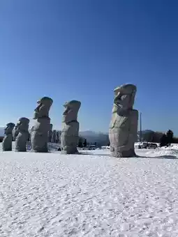 Within the cemetery, you'll find beautiful cherry blossoms, autumn foliage, and a grassy plaza. When I visited during winter, the snow-covered scenery was breathtakingly beautiful. The site features replicas of famous landmarks such as Stonehenge, Moai statues, and a massive Buddha monument, making it a great spot for taking photos.