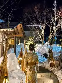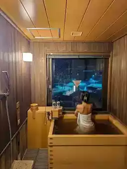 Each room features a private hinoki bath, allowing you to relax while admiring the beautiful snowy scenery.