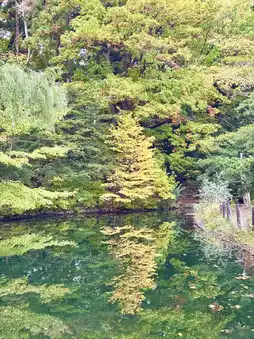 The autumn leaves reflected in the pond are also beautiful.