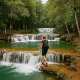 A short walk further, you'll find a bridge over the waterfall, spanning a crystal-clear stream. This popular photo spot is a must-see. The cascading waterfalls are breathtakingly beautiful, like a painting.